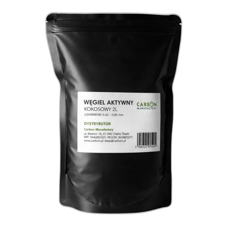 Wzór: C. CAS: 7440-44-0. Produkt pochodzący z łupin kokosowych. Frakcja ziaren: 0,42–0,85 mm. Objętość: 2 L. Czystość: min. 98%. Masa molowa: 12,01 g/mol. Wysoka odporność mechaniczna. Charakteryzuje się długim czasem życia w filtrach. Naturalne źródło zapewnia ekologiczne zastosowanie.