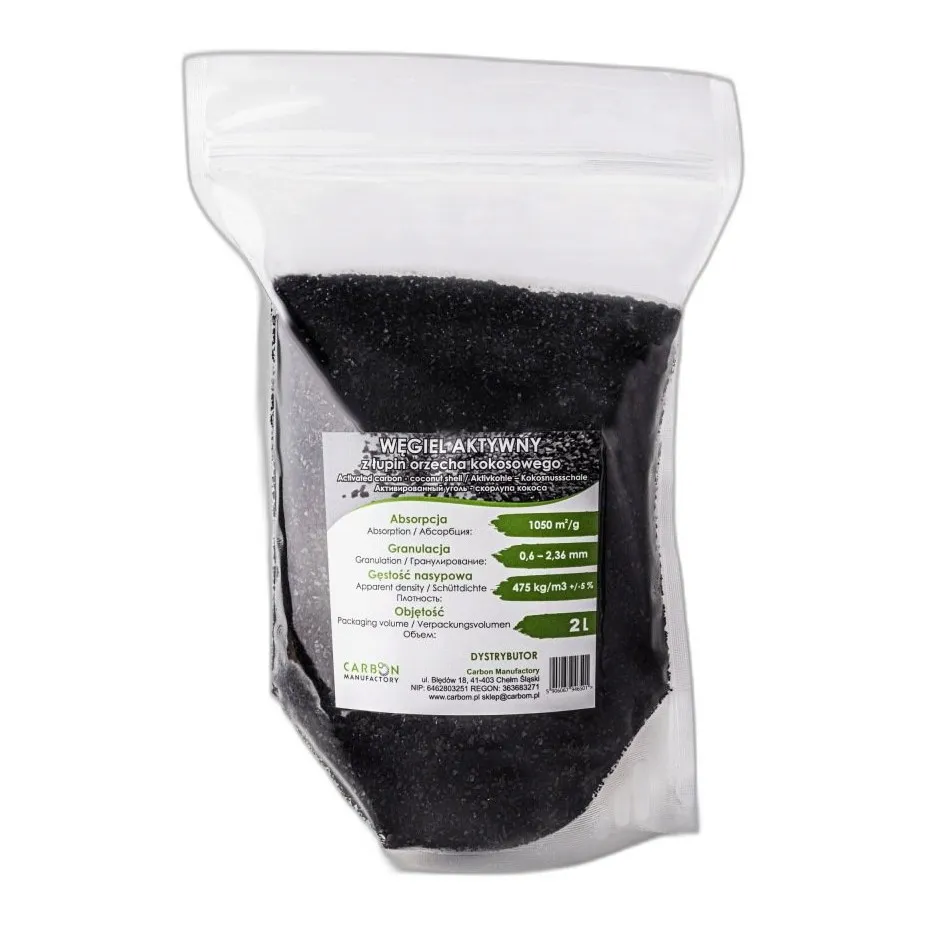 Węgiel aktywny pochodzenia roślinnego, wytwarzany z łupin kokosowych. Wzór: C. CAS: 7440-44-0. Forma: drobne granulki. Czystość: min. 96%. Masa molowa: 12,01 g/mol. Powierzchnia: 1000–1300 m²/g. Niski poziom metali ciężkich. Naturalna struktura porowata, odporna na kruszenie.